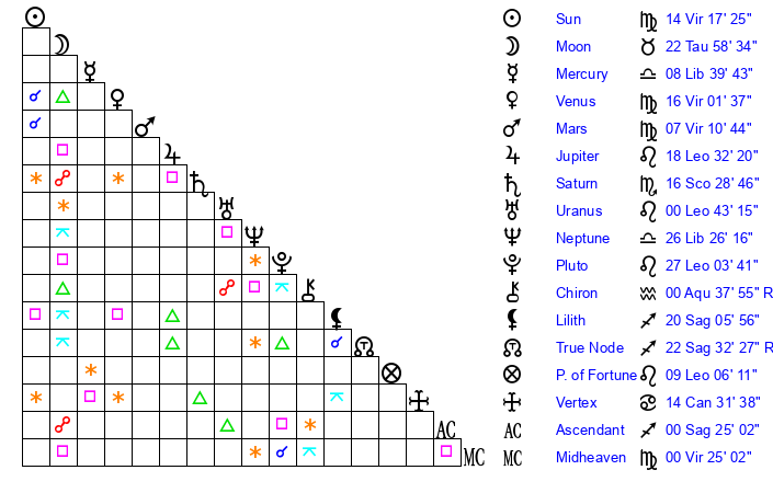 | Moon | 22 Taurus 50 | 14 Pisces 39 | 17 Sagittarius 43 |