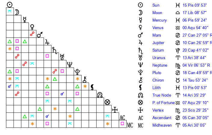 | Moon | 17 Libra 3 | 16 Gemini 40 | 21 Pisces 43 |