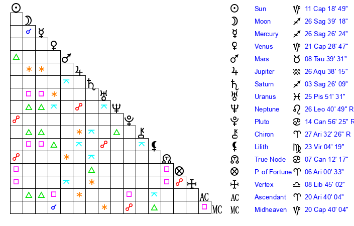 | Moon | 26 Sagittarius 39 | 17 Aquarius 5 | 9 Leo 14 |