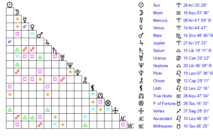 | Pluto | 19 Leo 7 | 3 Aquarius 45 | 19 Leo 54 |