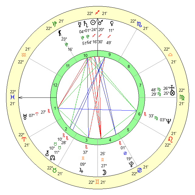 | Neptune | 3 Virgo 34 | 29 Pisces 22 | 1 Virgo 26 |