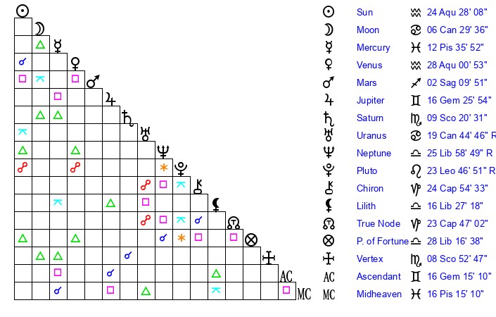 | Sun | 24 Aquarius 28 | 25 Aquarius 15 | 4 Taurus 56 |