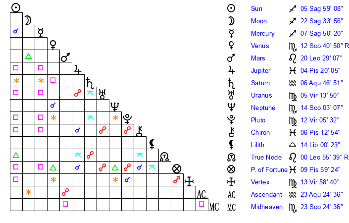 | Moon | 22 Sagittarius 39 | 11 Pisces 51 | 18 Aries 5 |