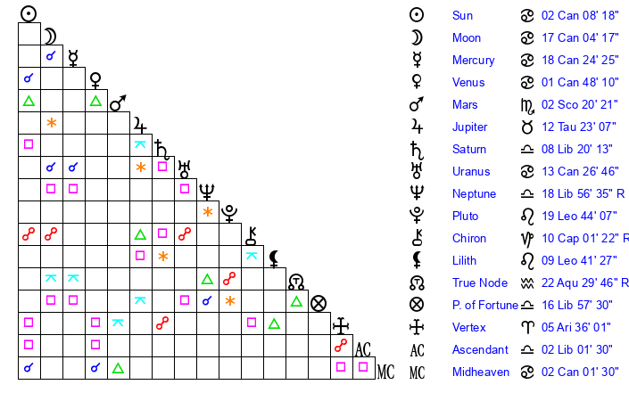 | Moon | 16 Cancer 59 | 8 Gemini 40 | 20 Pisces 3 |