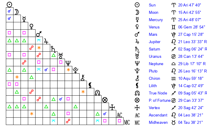 | Sun | 20 Aries 47 | 21 Aries 4 | 27 Gemini 24 |