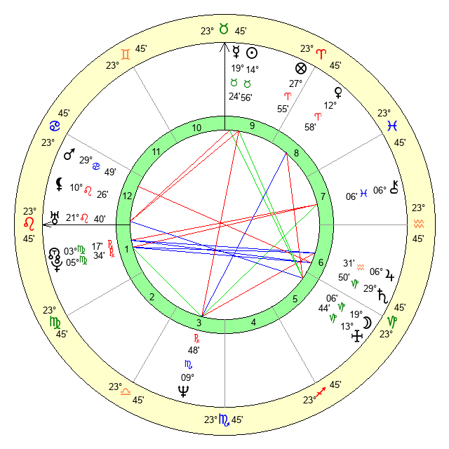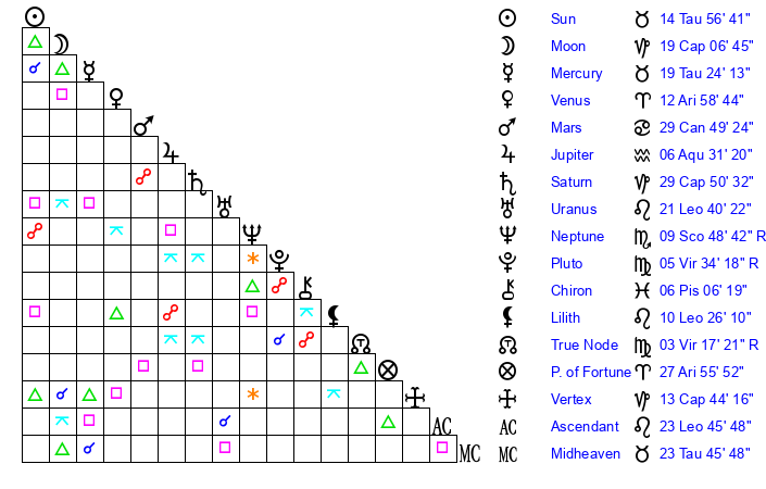 | Moon | 19 Capricorn 6 | 28 Leo 42 | 29 Taurus 40 |