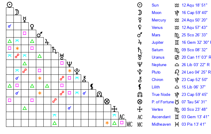 | Saturn | 9 Scorpio 38 | 17 Pisces 26 | 7 Scorpio 34 |