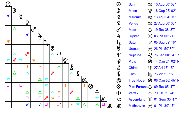 | Moon | 18 Capricorn 27 | 10 Pisces 40 | 0 Virgo 0 |