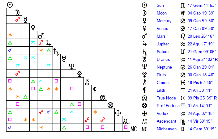 | Sun | 17 Gemini 45 | 18 Gemini 52 | 4 Libra 28 |