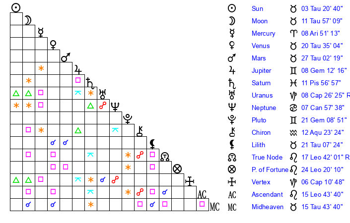 | Moon | 11 Taurus 53 | 17 Pisces 38 | 14 Virgo 53 |