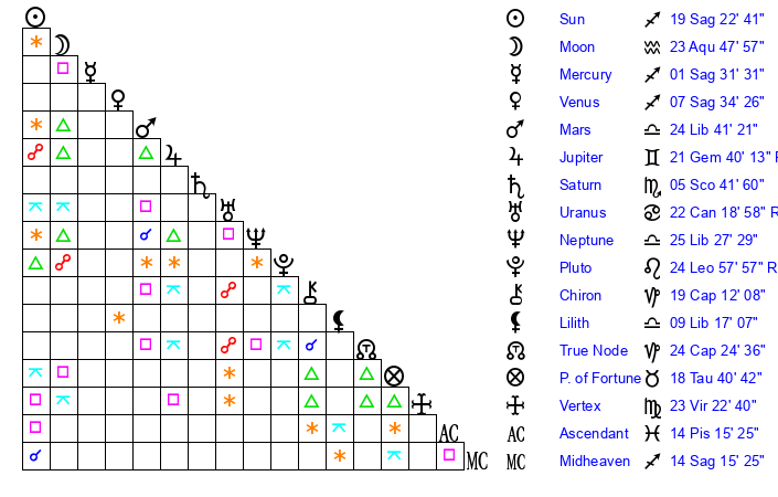 | Sun | 19 Sagittarius 22 | 19 Sagittarius 54 | 2 Pisces 32 |