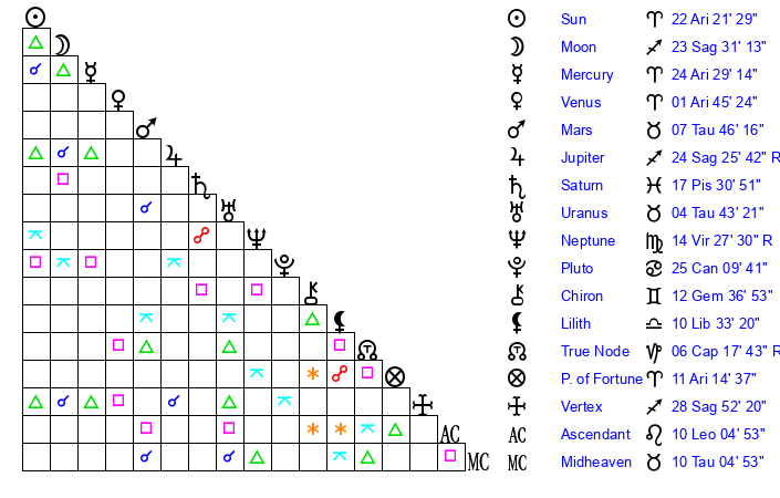 | Sun | 22 Aries 21 | 22 Aries 47 | 17 Cancer 58 |