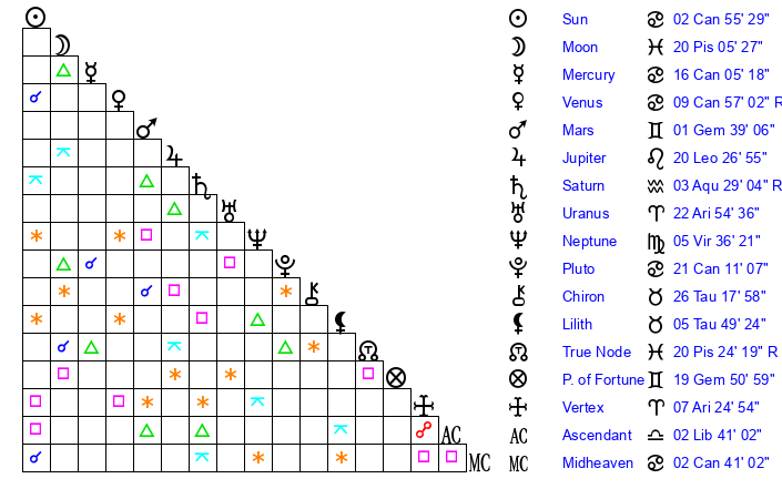 | Mercury | 16 Cancer 6 | 27 Cancer 10 | 29 Virgo 23 |
