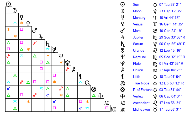 | Moon | 23 Capricorn 14 | 21 Taurus 28 | 14 Gemini 20 |