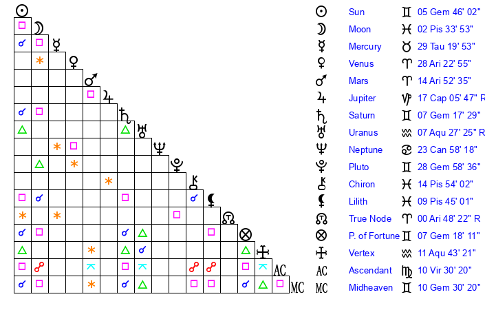 | Saturn | 7 Gemini 54 | 0 Aries 5 | 18 Gemini 40 |