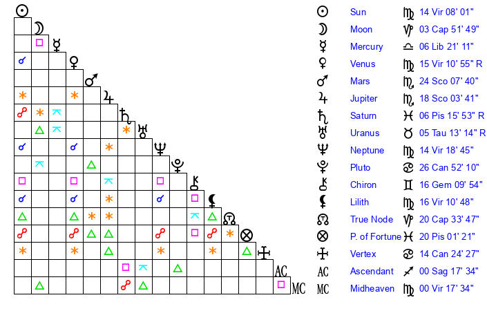 | Sun | 14 Virgo 8 | 15 Virgo 19 | 13 Sagittarius 39 |