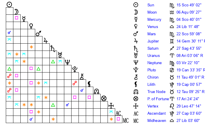 | Sun | 15 Scorpio 49 | 16 Scorpio 32 | 23 Aquarius 16 |