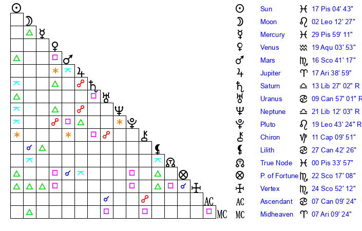 | Neptune | 21 Libra 11 | 29 Pisces 8 | 19 Libra 21 |