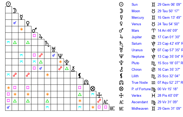 | Moon | 29 Taurus 50 | 24 Aries 37 | 18 Virgo 8 |