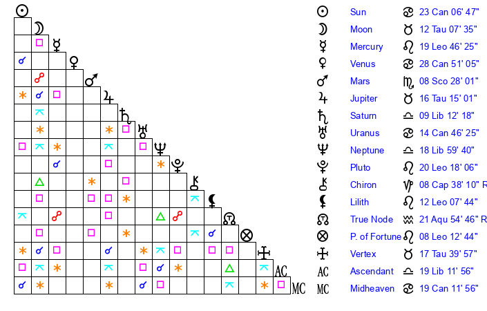 | Moon | 12 Taurus 8 | 23 Pisces 19 | 1 Capricorn 37 |