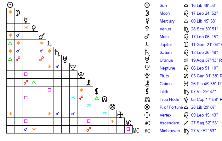 | Neptune | 6 Leo 51 | 0 Aries 16 | 5 Leo 43 |