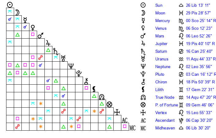 | Moon | 0 Aries -36 | 18 Libra 34 | 10 Aries 11 |