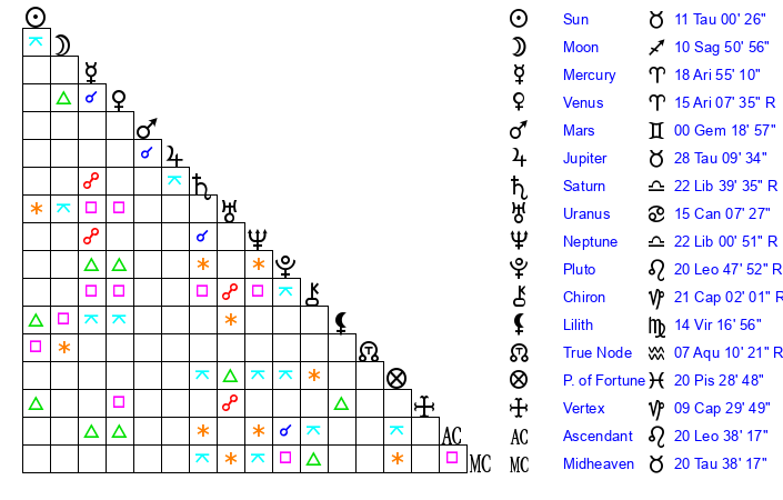 | Sun | 11 Taurus 0 | 11 Taurus 34 | 20 Cancer 1 |