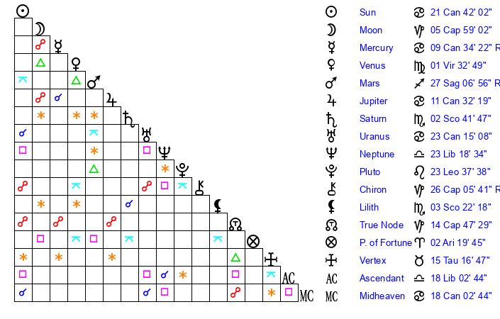 | Moon | 6 Capricorn 5 | 9 Pisces 42 | 21 Leo 51 |
