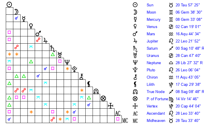 | Uranus | 28 Cancer 49 | 26 Taurus 57 | 2 Leo 17 |
