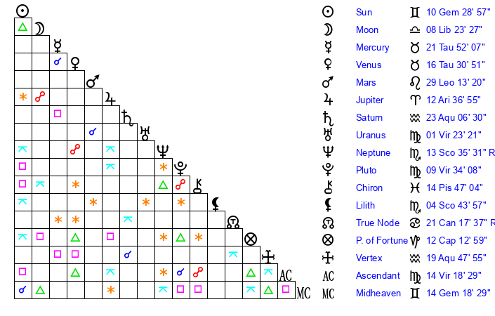 | Sun | 10 Gemini 29 | 11 Gemini 27 | 9 Leo 41 |