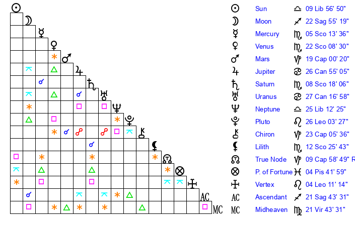 | Sun | 9 Libra 56 | 10 Libra 44 | 21 Sagittarius 9 |