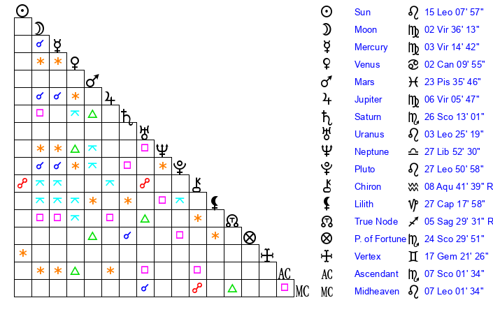 | Pluto | 27 Leo 50 | 2 Aquarius 15 | 29 Leo 54 |