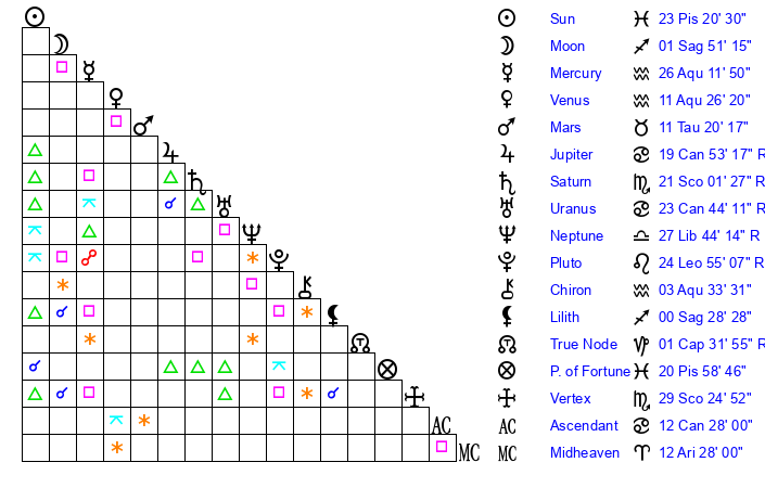 | Saturn | 21 Scorpio 31 | 22 Pisces 18 | 17 Scorpio 21 |
