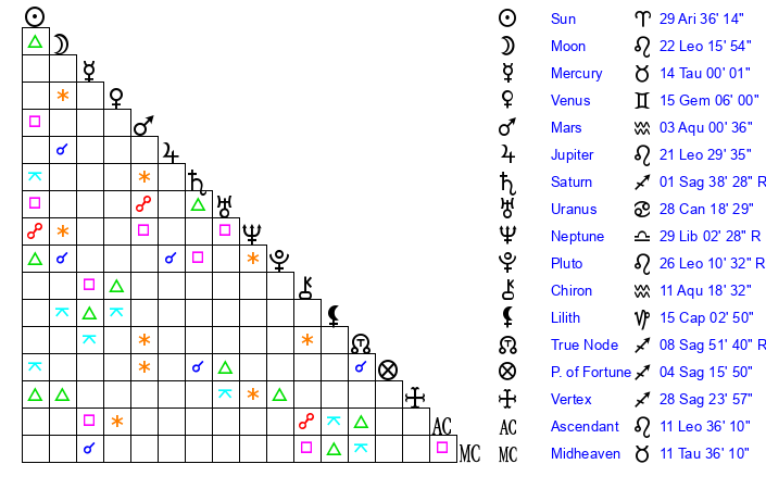 | Moon | 22 Leo 22 | 13 Capricorn 43 | 24 Aquarius 28 |