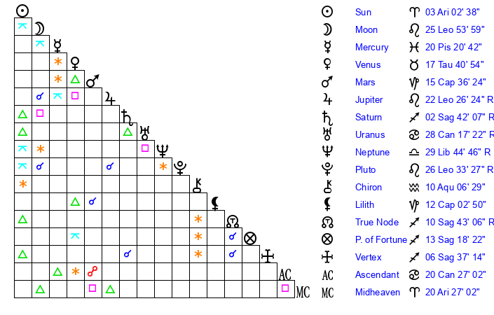 | Pluto | 26 Leo 32 | 3 Aquarius 24 | 26 Leo 13 |
