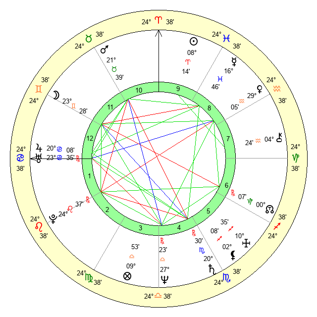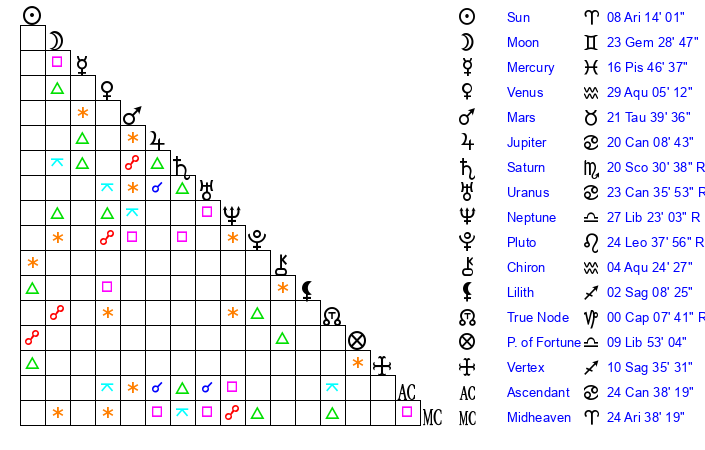 | Moon | 23 Gemini 30 | 12 Aries 48 | 9 Capricorn 14 |