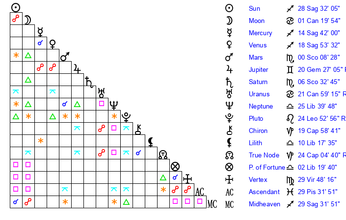 | Sun | 28 Sagittarius 32 | 29 Sagittarius 4 | 11 Pisces 35 |
