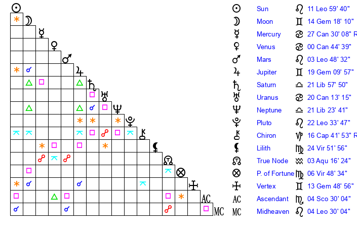 | Sun | 11 Leo 59 | 12 Leo 34 | 22 Libra 2 |