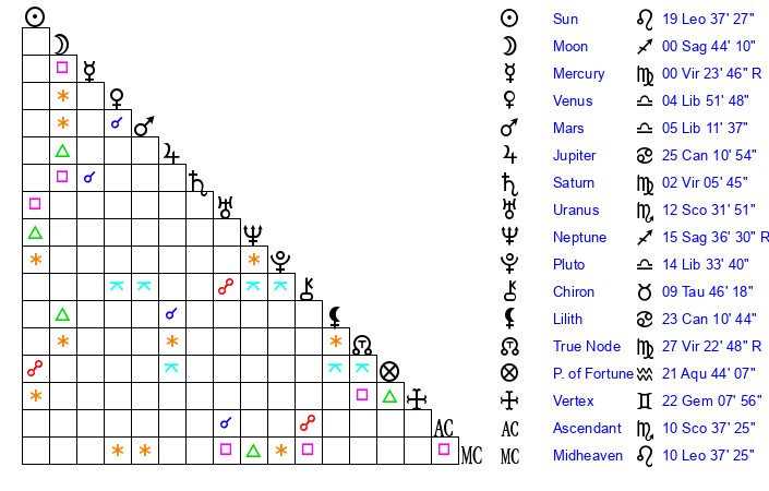 | Moon | 0 Sagittarius 40 | 3 Aries 42 | 24 Leo 25 |