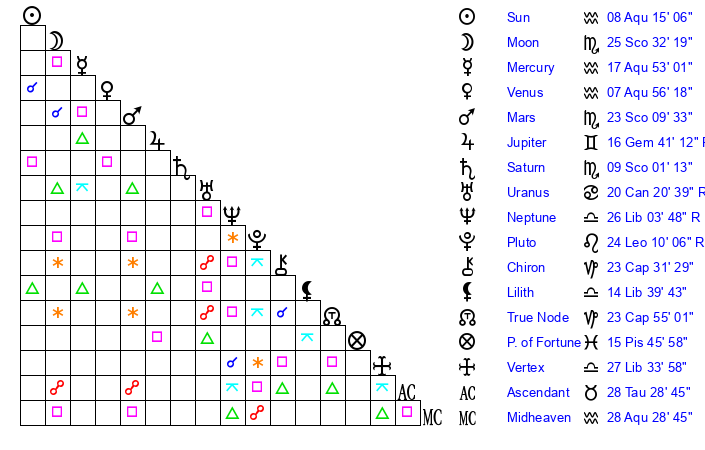| Sun | 8 Aquarius 15 | 9 Aquarius 2 | 19 Aries 18 |