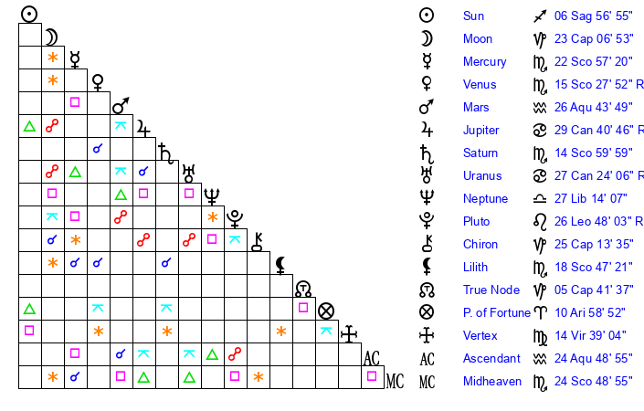 | Sun | 6 Sagittarius 57 | 7 Sagittarius 43 | 19 Aquarius 10 |