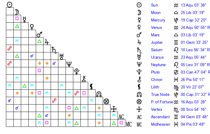 | Venus | 24 Aquarius 51 | 28 Pisces 46 | 14 Aries 56 |