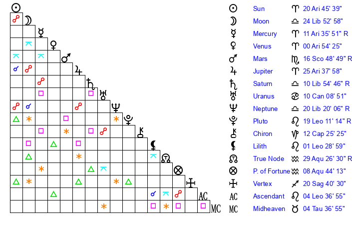 | Moon | 24 Libra 57 | 25 Virgo 48 | 4 Cancer 54 |