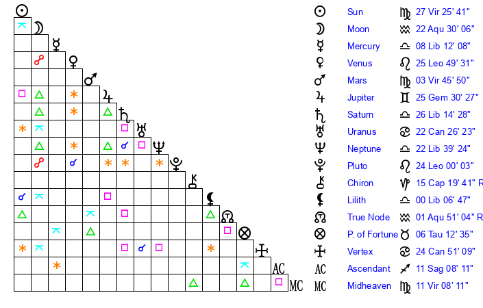 | Sun | 27 Virgo 25 | 27 Virgo 59 | 9 Sagittarius 13 |