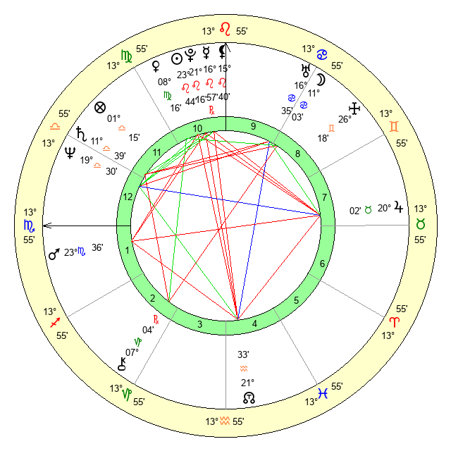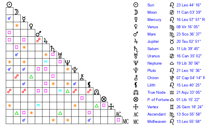| Sun | 23 Leo 44 | 24 Leo 5 | 5 Scorpio 13 |