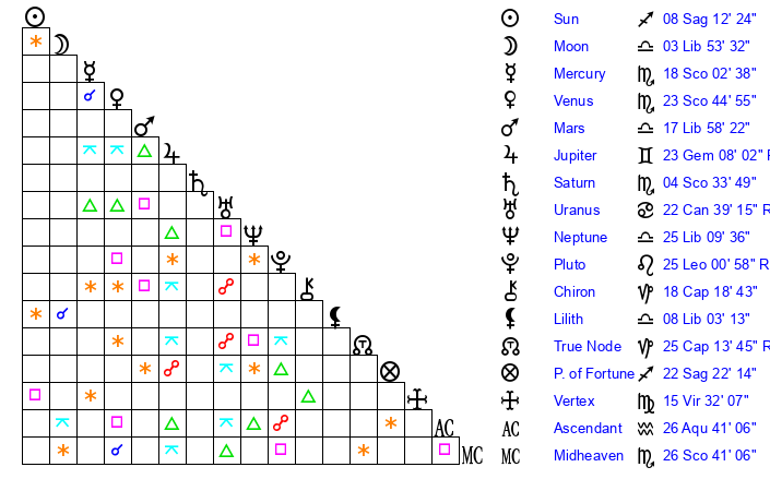 | Neptune | 25 Libra 10 | 29 Pisces 23 | 26 Libra 0 |