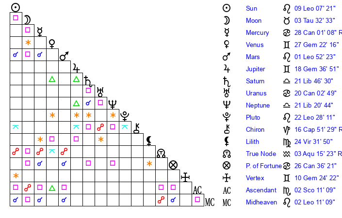 | Pluto | 22 Leo 28 | 2 Aquarius 24 | 24 Leo 32 |