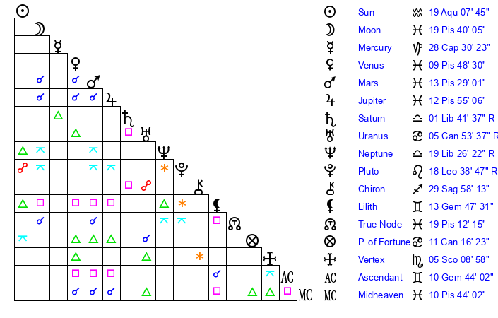 | Neptune | 19 Libra 26 | 28 Pisces 12 | 17 Libra 45 |