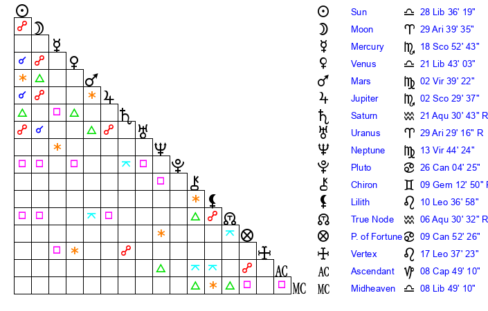 | Sun | 28 Libra 36 | 29 Libra 33 | 0 Aquarius 44 |