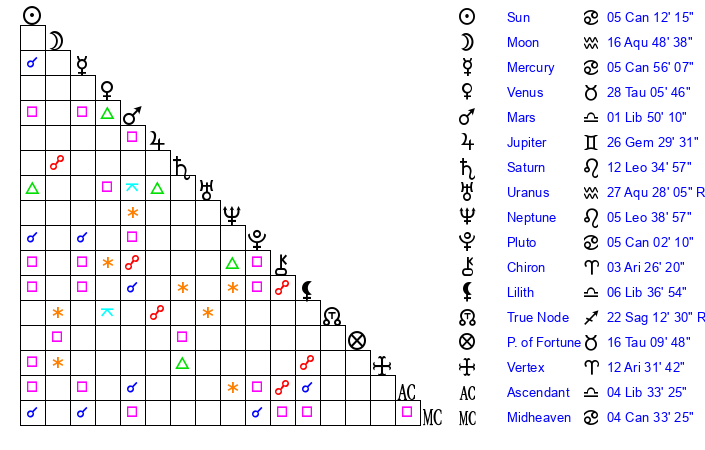 | Pluto | 5 Cancer 2 | 3 Aquarius 12 | 6 Cancer 38 |